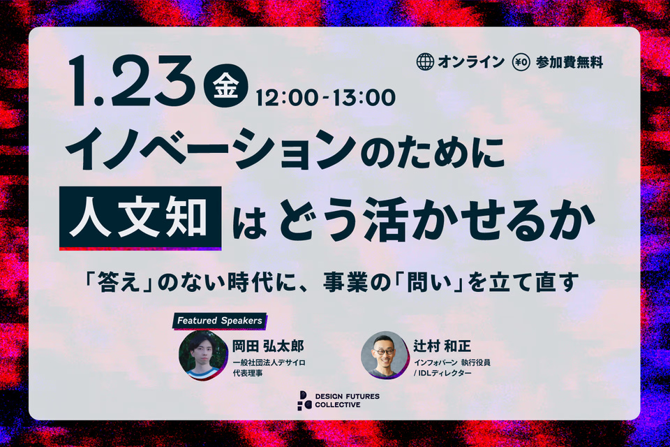 1月23日、Business Insider Japanが主宰する「Design Futures Collective」によるイベント「イノベーションのために人文知はどう活かせるか――「答え」のない時代に、事業の「問い」を立て直す」に登壇し、ここまで記載したような内容について、インフォバーン執行役員の辻村和正さんと議論させていただきます。無料視聴が可能ですので、関心のある方はぜひチェックしてみてください。