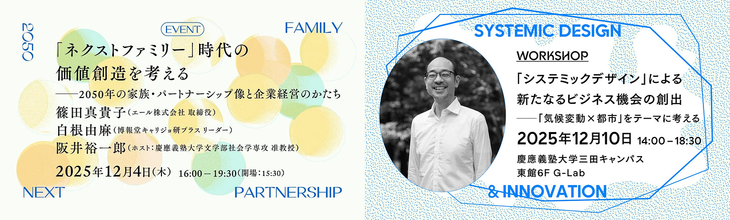 活動の第一弾として、12月4日にはセミナーイベント「『ネクストファミリー』の時代の価値創造を考える」が、12月10日には「気候変動 × 都市」をテーマに、システミックデザインの手法を活用して新しいビジネス機会を考えるワークショップが、それぞれ開催されました。