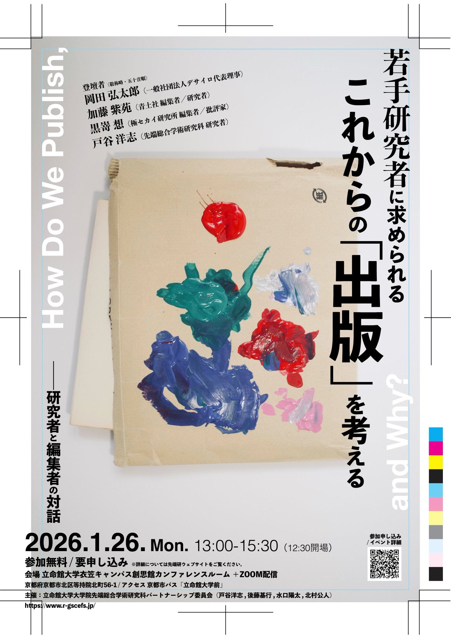 また本企画は、本学パートナーシップ委員会が重視する「院生と教員が共に議論する場づくり」を推進する試みでもあります。「出版」というテーマを介して、院生・教員・学外研究者・編集者が交差し、それぞれの立場から知を社会へ届ける方法を考える対話の場を創出します。