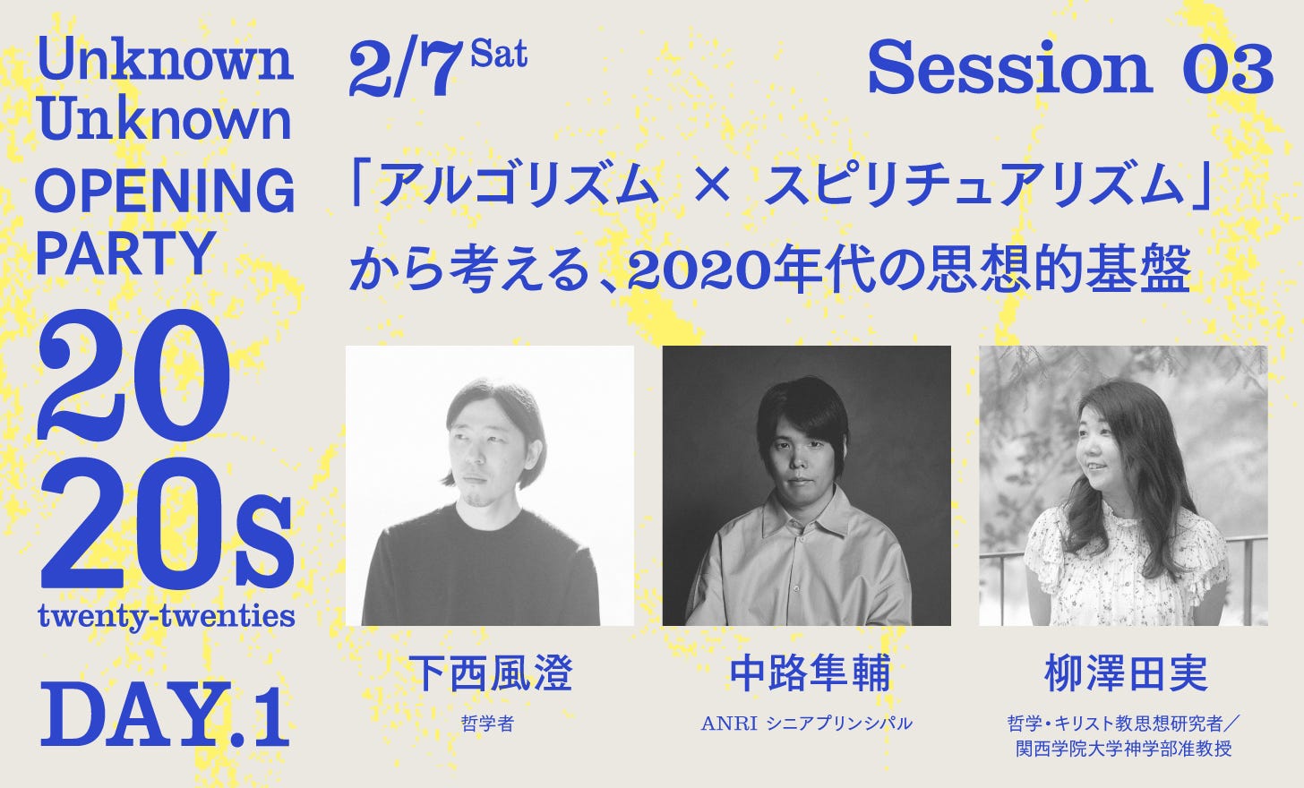 「アルゴリズムとスピリチュアリズム」をテーマとする新著を執筆中の哲学者・下西風澄さん、ベンチャーキャピタルANRIにて「人文奨学金」などのプログラムを手がける投資家の中路隼輔さん、哲学・キリスト教思想を専門とし、米国におけるテクノロジーと宗教の関係性について研究を進める柳澤田実さんをお招きし、2020年代を支える思想的基盤について、テクノロジー、宗教、哲学、政治を横断しながら考えます。